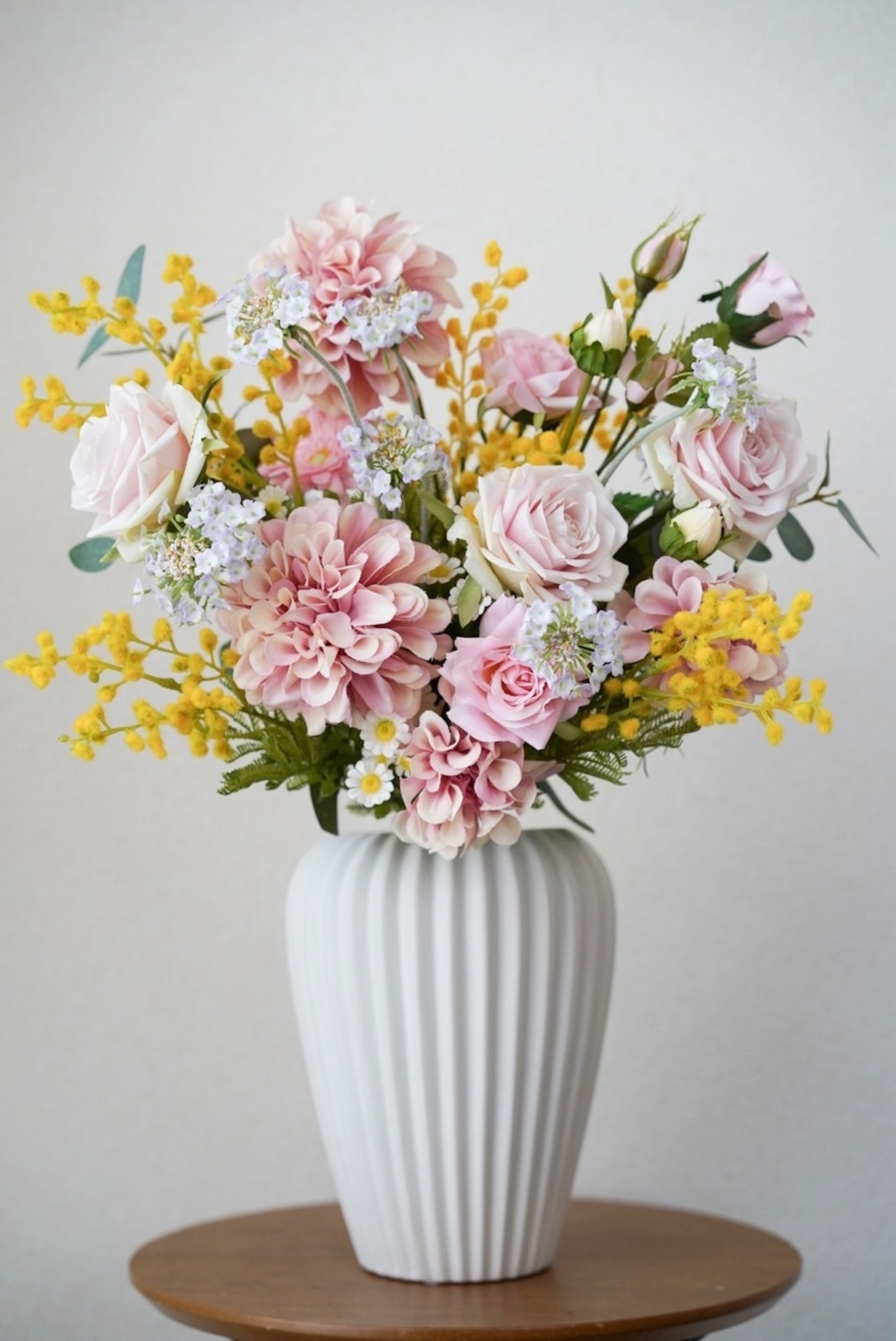 特別な日や普段使いにぴったりなアーティフィシャルフラワーブーケ。淡いピンクのダリアとローズに、やさしいイエローのミモザを合わせた、明るく華やかなブーケ。優しい色合いがベースなのでどんな空間にも馴染みます。ご自宅用としてはもちろん、大切な方への贈り物にもおすすめです。